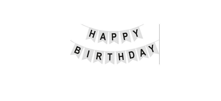 Baner srebrny Happy Birthday, z czarnym napisem